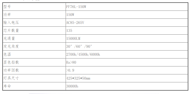 led泛光燈PF76L-150W產(chǎn)品特點(diǎn): 1外殼采用高壓鑄鋁,散熱性能好 2薄燈體,體積小、重量輕,精致美觀 3燈體采用鋼化玻璃和防水硅膠密封,防護(hù)等級(jí)IP65 4光源均采用高流明LED芯片,內(nèi)置恒流電源 5反光杯多種角度可選,既可用于泛光大面積照明也可用于投光遠(yuǎn)距離照明。 適用范圍: 建筑物、體育場(chǎng)、廣場(chǎng)、碼頭、綠化照明、廣告、大廈外景、車站、鐵路、隧道、港口等戶外照明 led泛光燈PF76L-150W產(chǎn)品參數(shù)